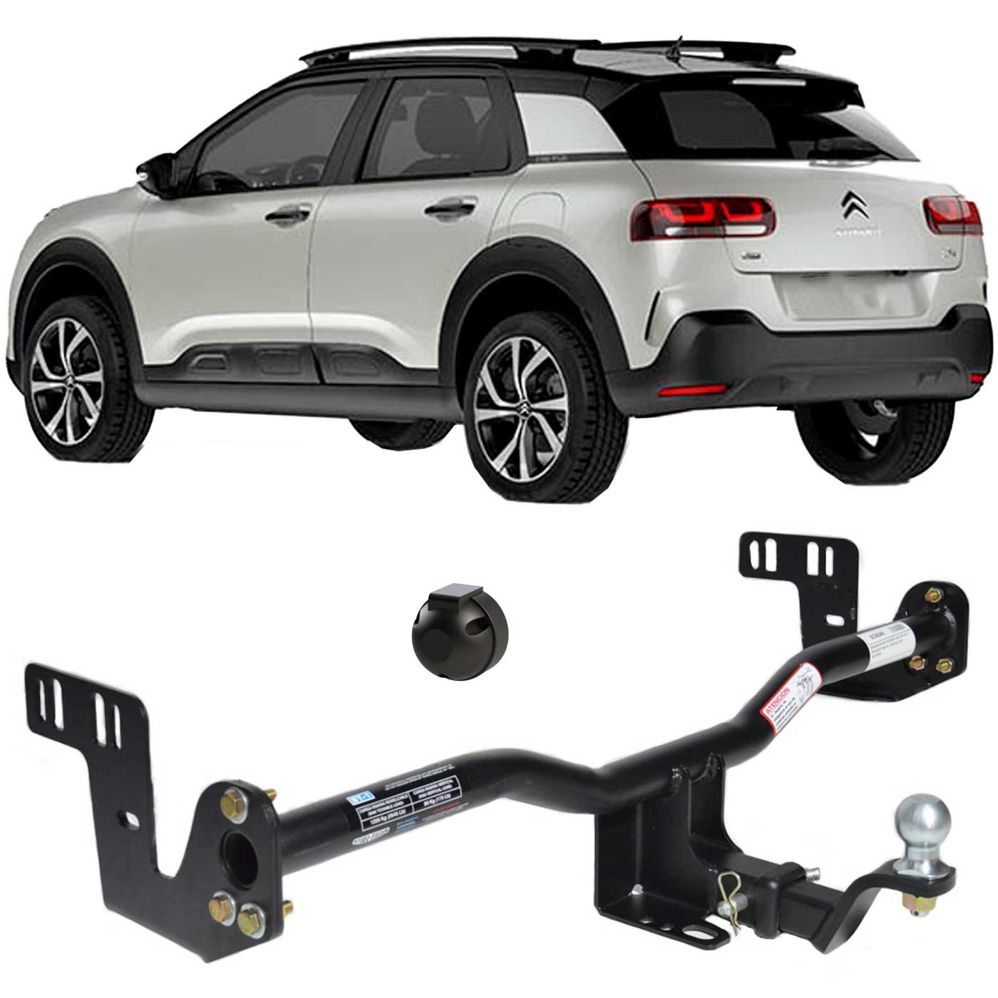 Enganche Con Bocha Citroen C4 Cactus 2021 a 2025 Feel, Shine, Puretech Enganche STEELTIGER ST1 diseñado específicamente y homologado para arrastres horizontales de hasta 1200 kg Soporta cargas verticales de hasta 80 kg. Características Caño estructural , Placas de acero bajo carbono , Pintura poliéster negra termoconvertible , Bulonería con recubrimiento zincado amarillo , Acople de fácil y práctica intercambiabilidad , Inlcuye soporte y ficha hembra.
