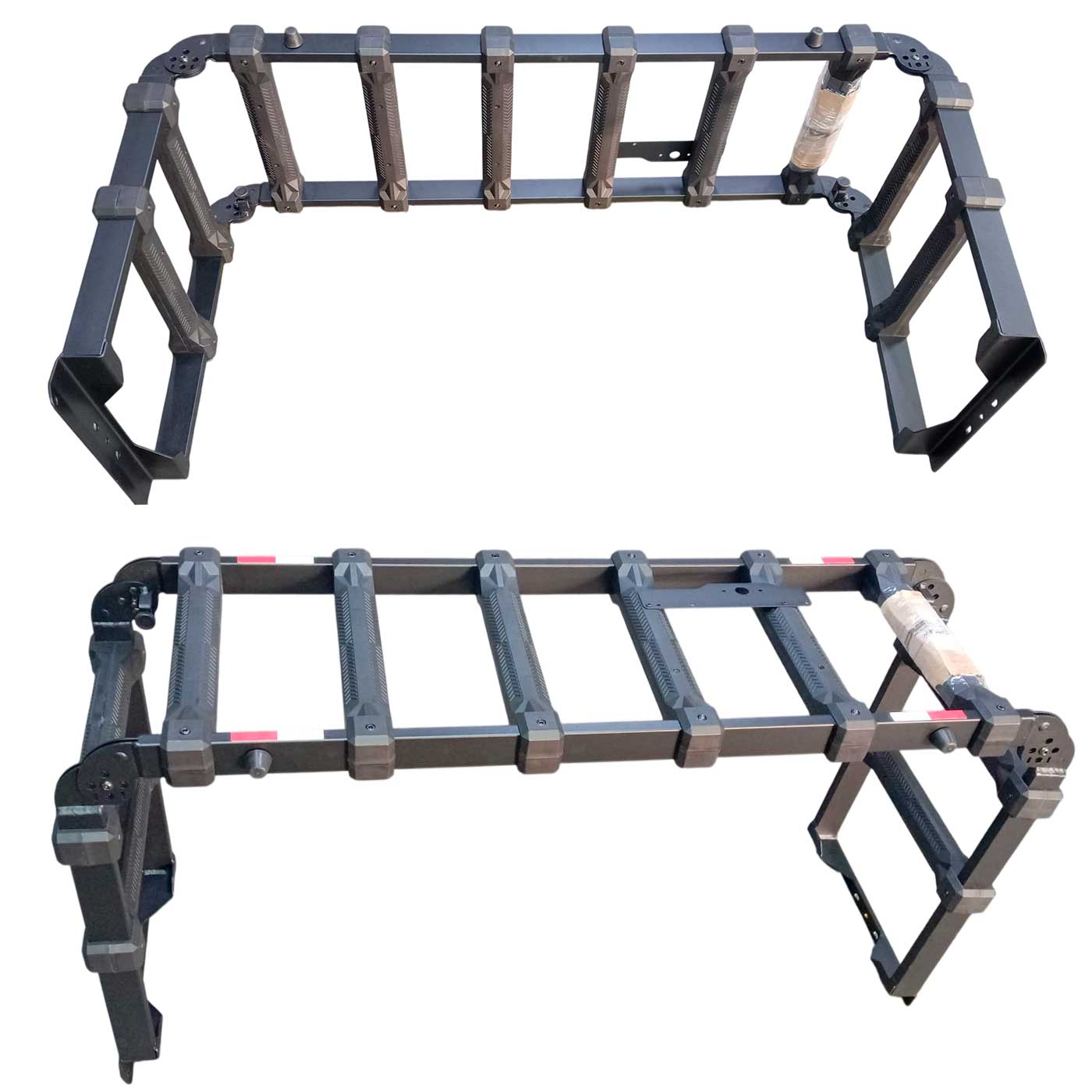 Extensor Divisor De Caja Escalera Ranger 2024 a 2026 El Extensor de Caja es el accesorio ideal para quienes necesitan más espacio y funcionalidad. Fue diseñado para facilitar el transporte de cargas grandes, ampliando el espacio útil de su pickup y ofreciendo tres funciones en un solo producto: 1. Extensor de Caja: Perfecto para transportar objetos que sobrepasan el límite de la caja, como motos, jet skis y otros equipos. 2. Separador de Carga: Cuando se pliega hacia el interior de la caja, actúa como separador, ayudando a acomodar e inmovilizar la carga, evitando que se desplace durante el trayecto. 3. Rampa: Facilita el acceso a la caja para el transporte de motos u otras cargas pesadas. Tiene capacidad para soportar hasta 200 kg. Para su seguridad y conformidad, el extensor cuenta con un espacio para la fijación de la placa y LEDs de iluminación, además de adhesivos reflectivos de señalización.