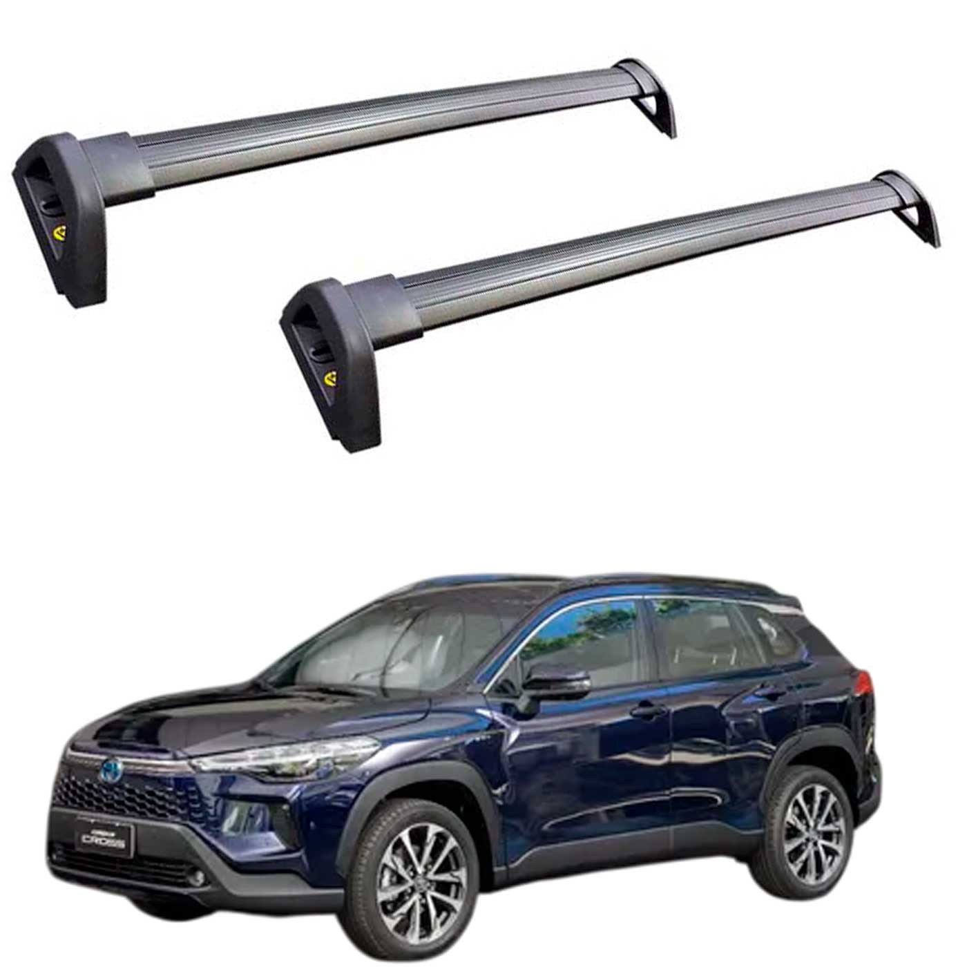 Barras de techo marca PROJECAR (Br) transversales en aluminio negro anodizado para Toyota Corolla Cross 2022 a 2025 Se colocan en los anclajes originales. Caños tabicados con banda superior de goma antideslizante. Punteras en plástico ABS. Recomendadas hasta 50 kg de carga por barra.