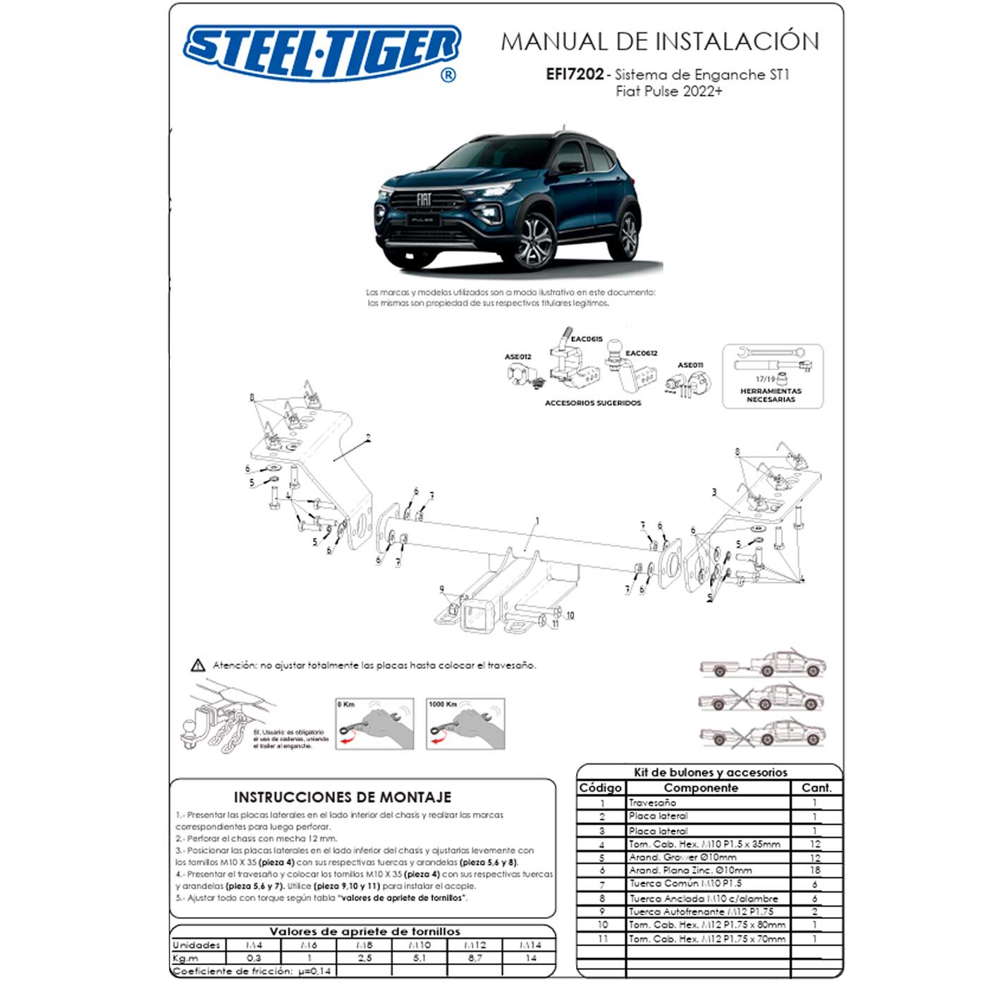 Enganche marca STEELTIGER (ARG) para Fiat Pulse 2022 a 2025 Homologado para arrastre de 750 kg. Carga vertigal 60 kg. Características • Caño estructural • Placas de acero bajo carbono • Pintura poliéster negra termoconvertible • Bulonería con recubrimiento zincado amarillo • Acople de fácil y práctica intercambiabilidad • Inlcuye soporte y ficha hembra. *