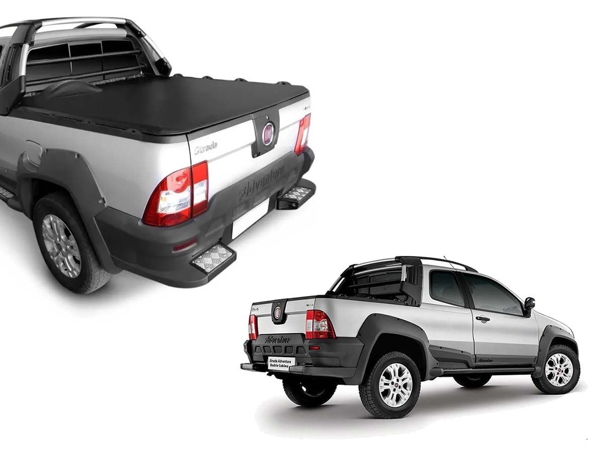 Lona maritima para Fiat Strada Adventure Locker Doble Cabina con ganchos originales y auxiliar 2009 A 2013 Lona maritima vinilica de PVC con protección UV y borde reforzado ribeteado con hilo 8x8 en poliéster. Nombre del modelo termo grabado en relieve del borde trasero derecho Incluye dos tensores centrales de cara cuadrada y extensión curvada para una mejor tensión general y despeje del agua hacia desde el centro a los laterales. Eslinga de acero con maroma apertura central Abrazaderas de aluminio inyectado super resistente para mejor sujeción Trek compuesto de piezas de aluminio inyectado con bordes y rincones suavizados para mejor cierre. Sellado de base completa con goma EVA.