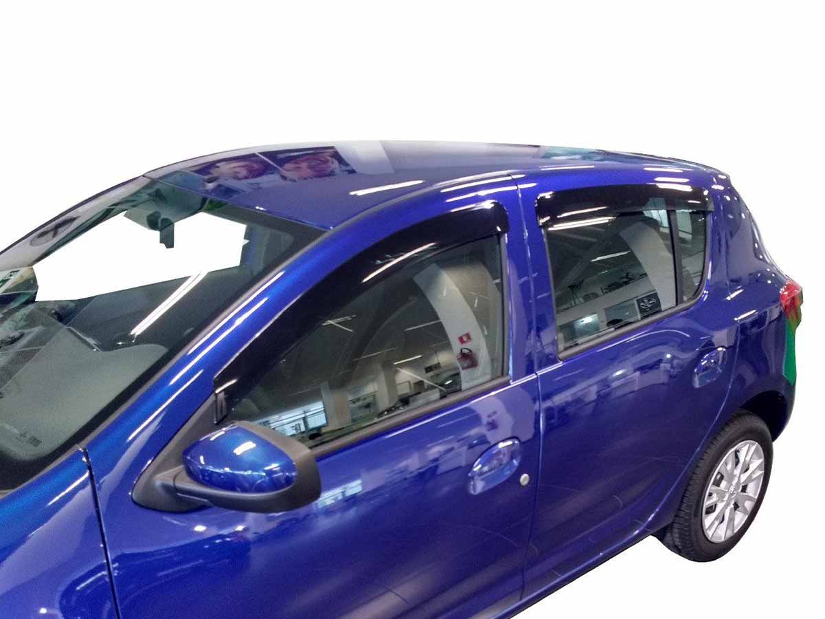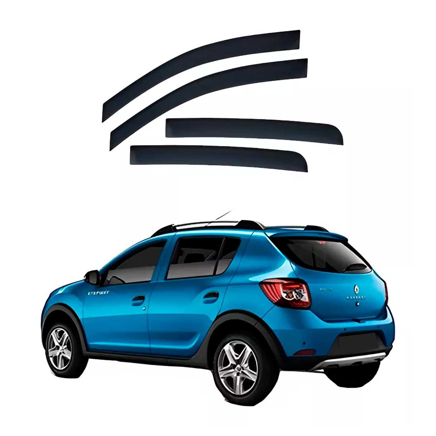 Kit de 4 goteros para Renault Sandero 2015 a 2025 y Stepway 2014 a 2024 color fume viene para instalarse en lado externo de la ventana con cinta doble faz incluida